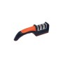 Basta passar a lâmina da faca pelo afiador, que possui uma pedra de afiação protegida por uma tampa plástica, que também ajuda na correta passagem da faca. O afiador tem base emborrachada para melhor fixação e segurança ao manusear o produto.